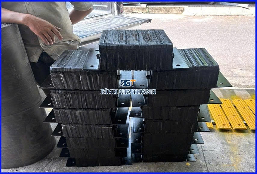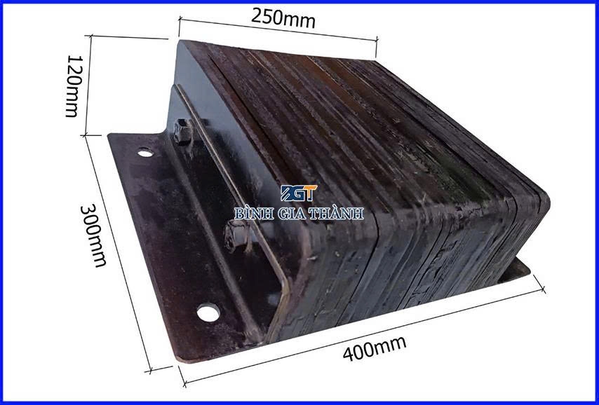 Các tấm thép cuối (end plates): Hai tấm thép ở hai đầu của khối cao su, được thiết kế để gắn chặt vào tường hoặc kết cấu của dock bằng bu-lông hoặc mối hàn.