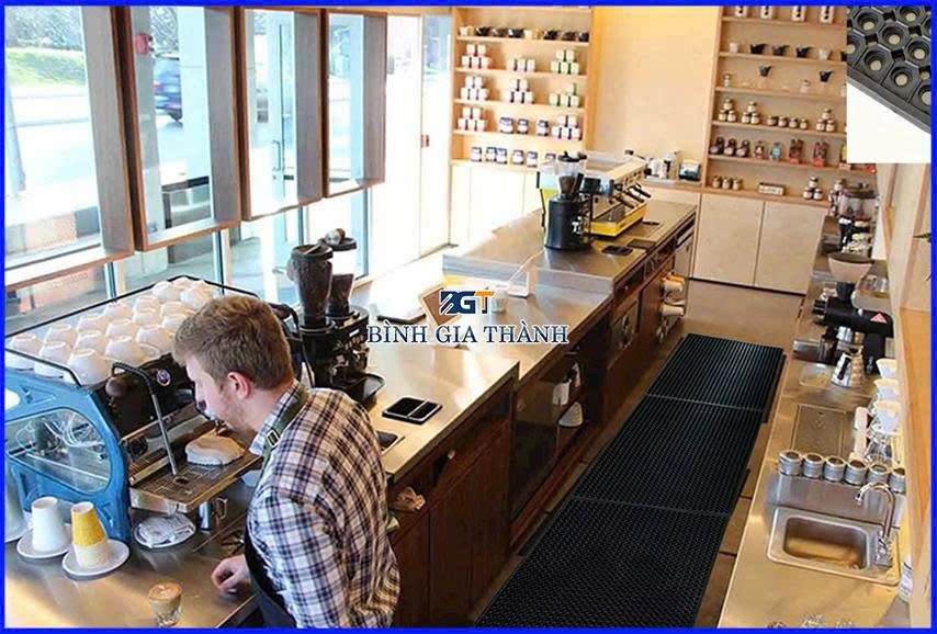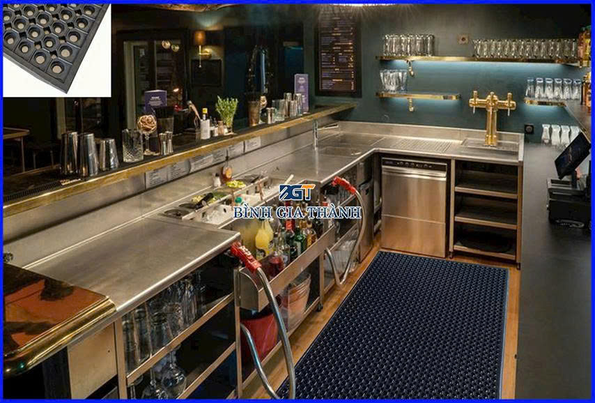 Khu vực quầy Bar và pha chế: Nơi thường xuyên rơi rớt đá viên và đồ uống có đường dễ gây trơn và bết dính. Một tấm cao su mỏng hơn nhưng có độ bám tốt sẽ giúp nhân viên pha chế di chuyển nhanh nhẹn và an toàn.
