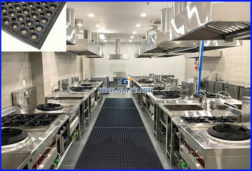 Khu vực bồn rửa và máy rửa bát: Đây là nơi luôn có nước tràn ra sàn. Các tấm cao su có lỗ thoát nước lớn là bắt buộc để đảm bảo nhân viên rửa bát không bị trượt ngã khi mang vác các khay bát đĩa nặng.
