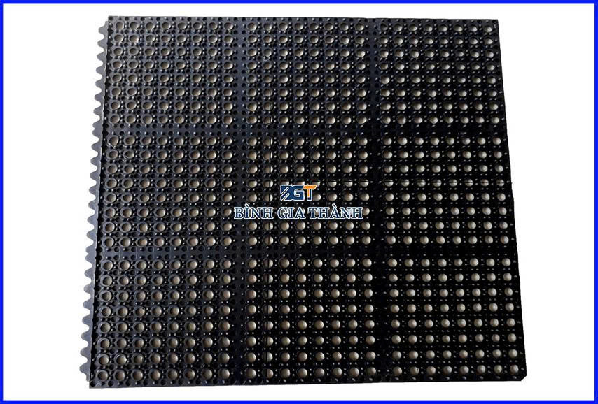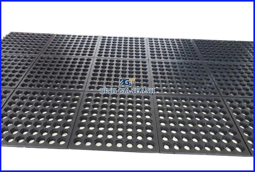 Khả năng chống trượt tuyệt đối trong môi trường ướt: Đây là ưu điểm sống còn. Bề mặt cao su có hệ số ma sát cực cao, ngay cả khi bị phủ một lớp nước hay dầu mỡ mỏng. Thiết kế vân nổi và các lỗ thoát nước giúp triệt tiêu hiện tượng "thủy kích" (lớp nước ngăn cách chân người với mặt sàn), từ đó ngăn chặn tối đa các tai nạn trượt ngã nguy hiểm.